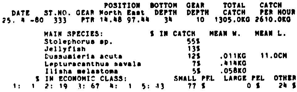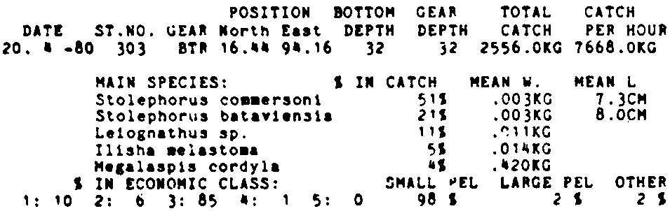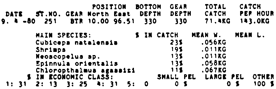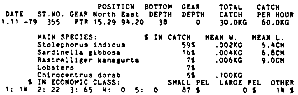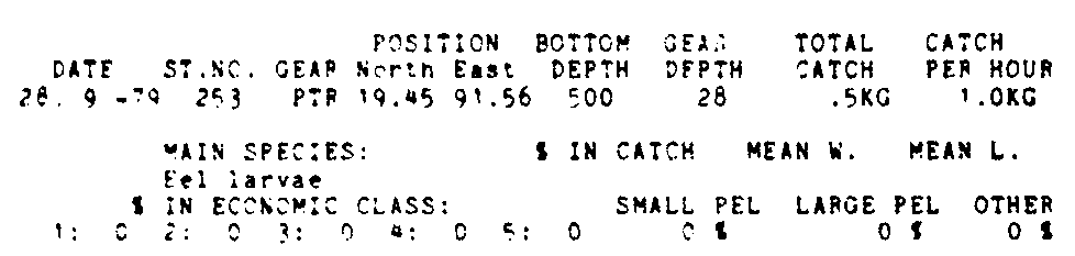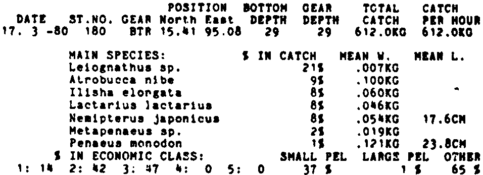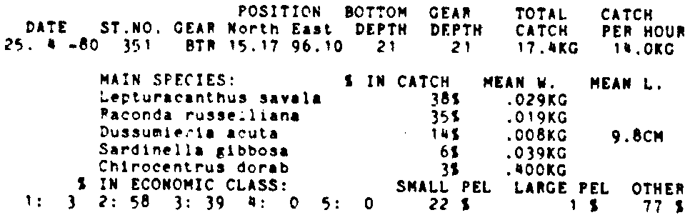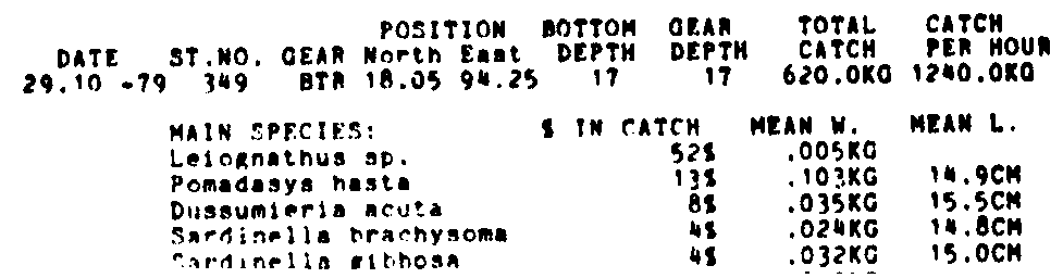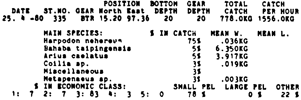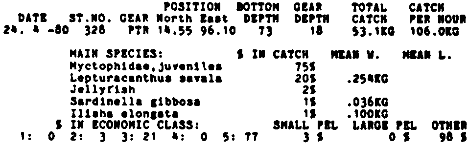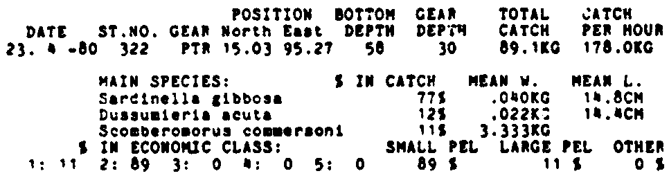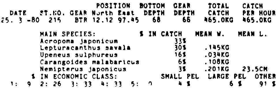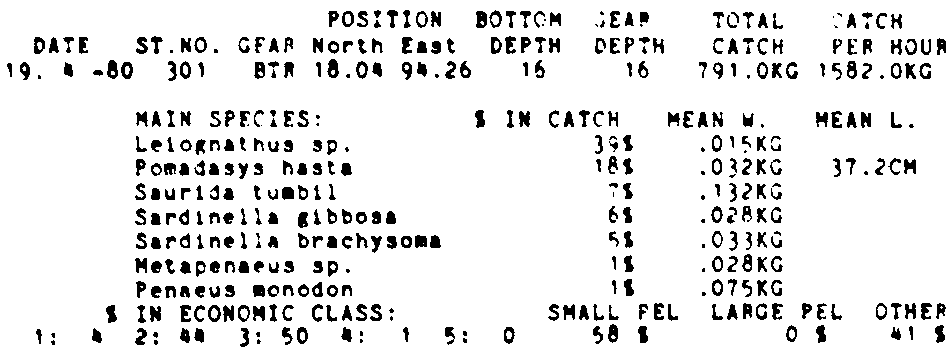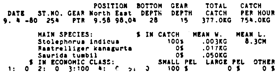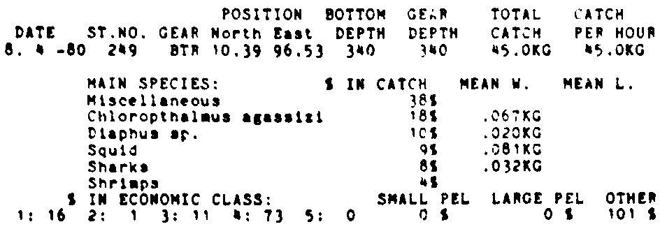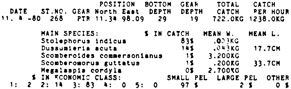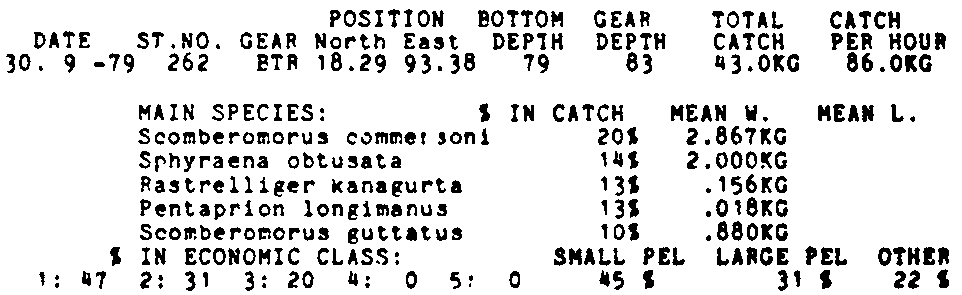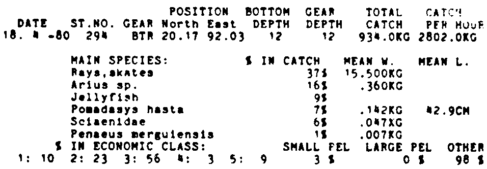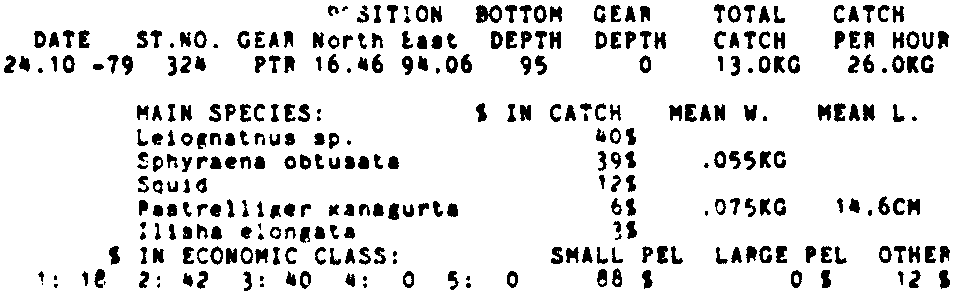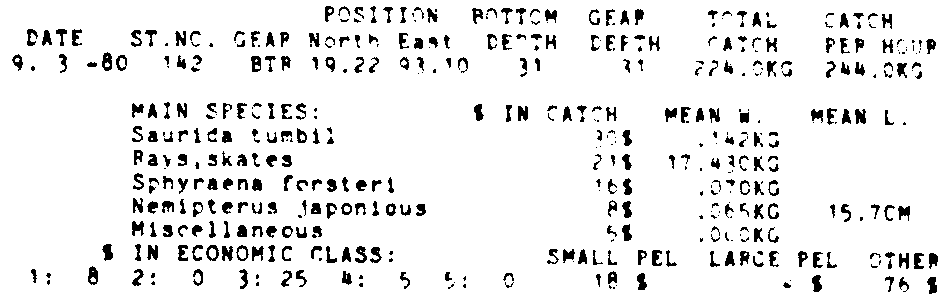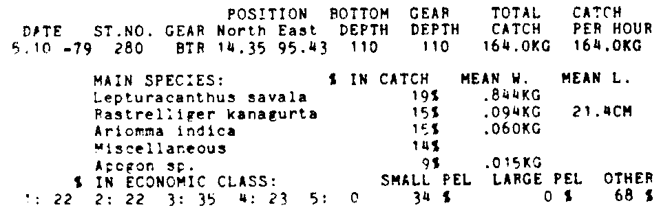 Only the five most important species are listed plus all shrimp catches. For some of the species the percentage of total catch is given as 0%. This means that the species in question is present at the station, but is less than 1% of the total catch.