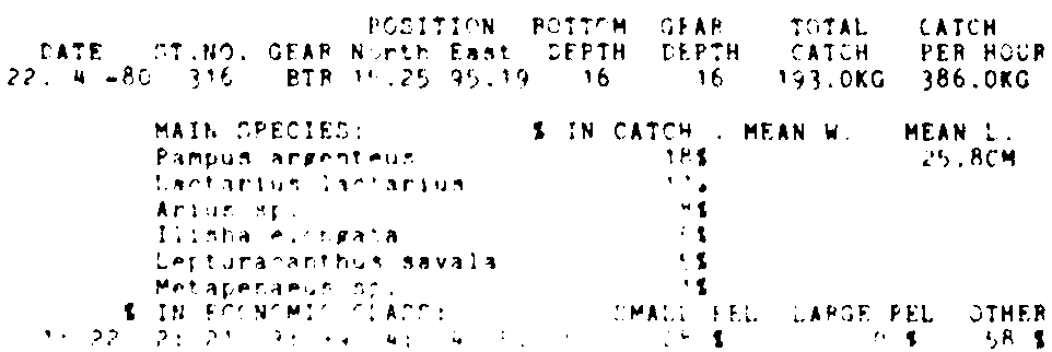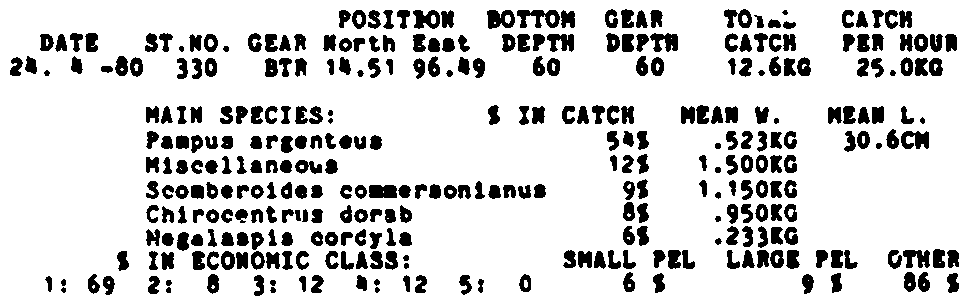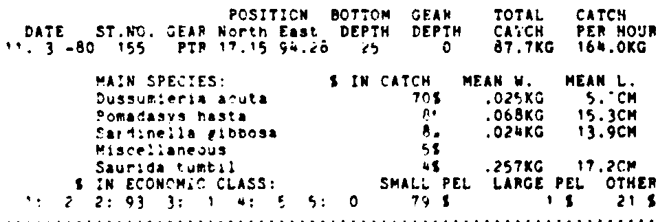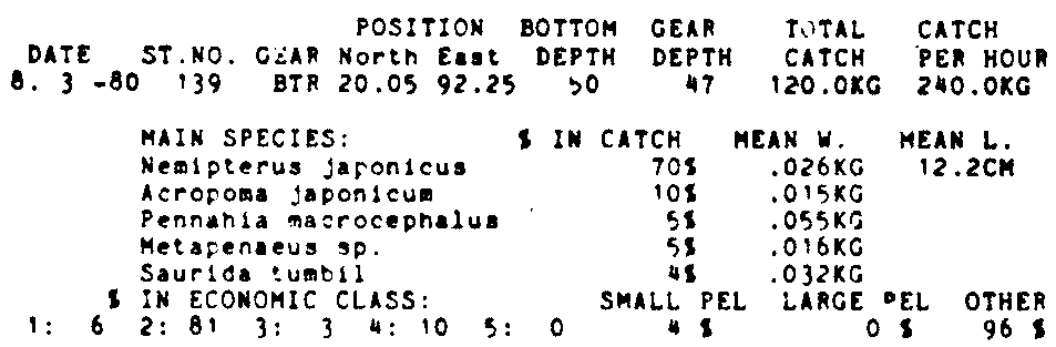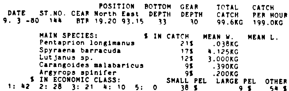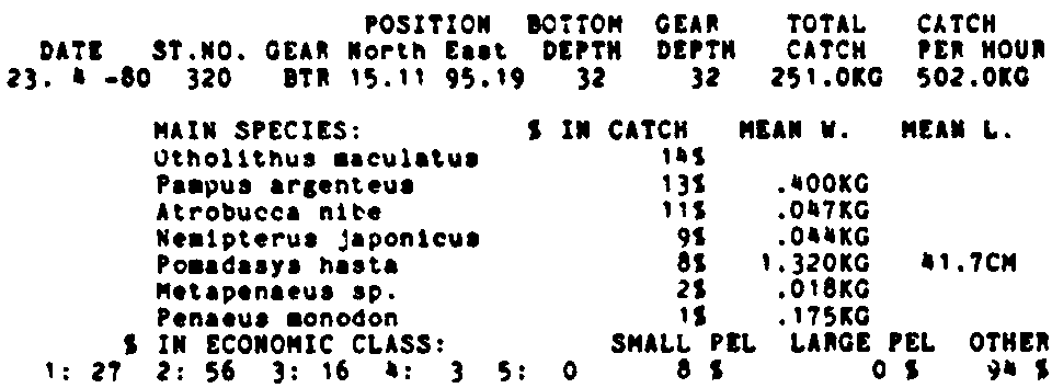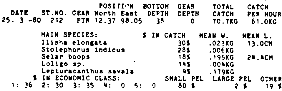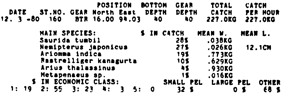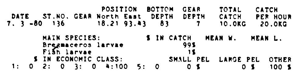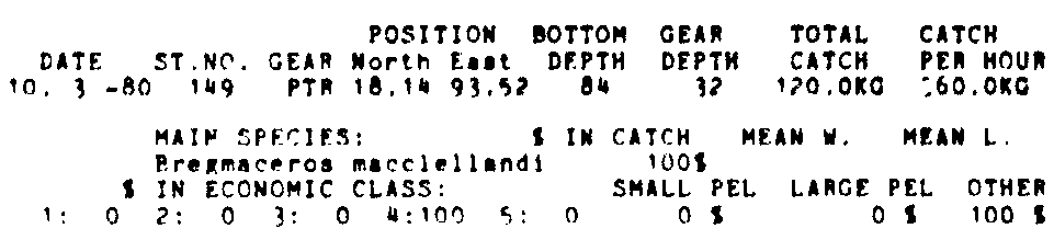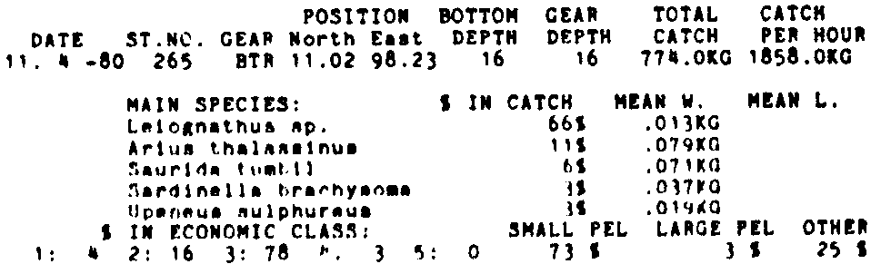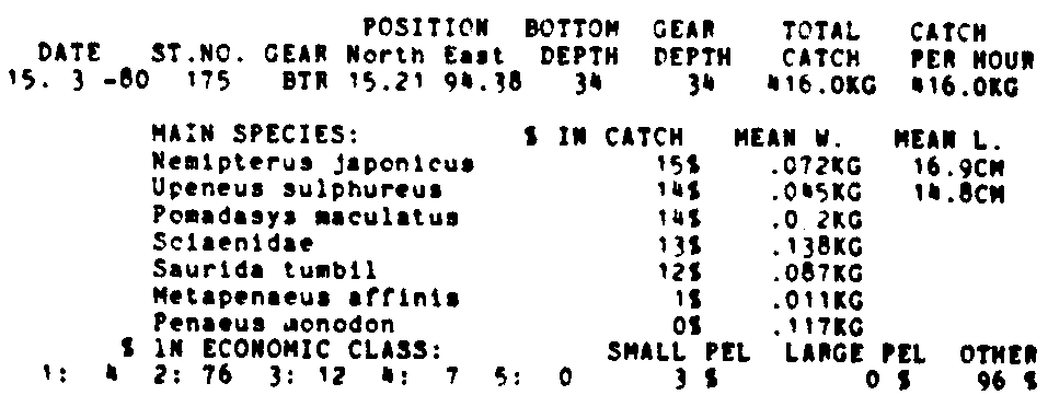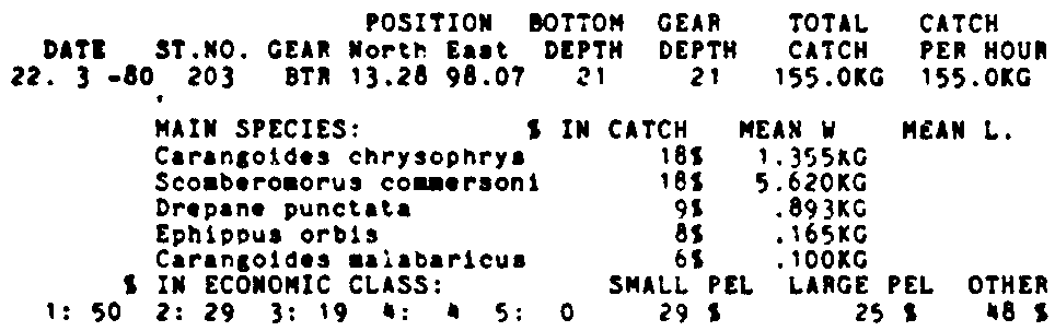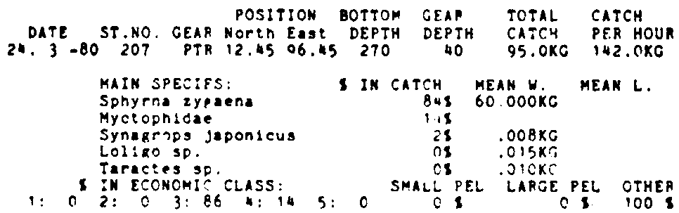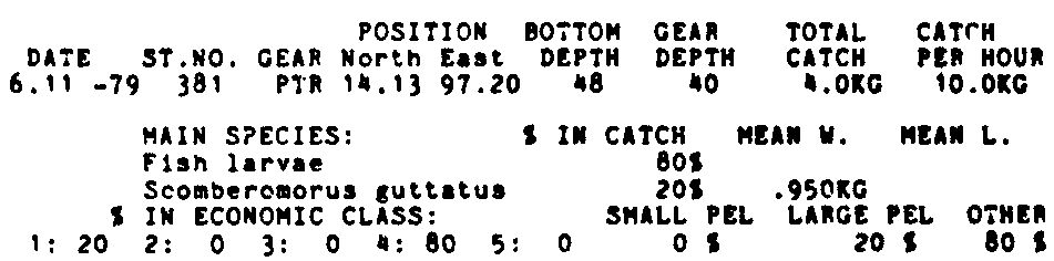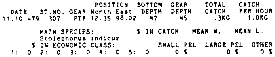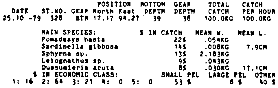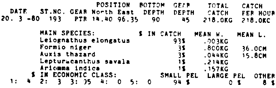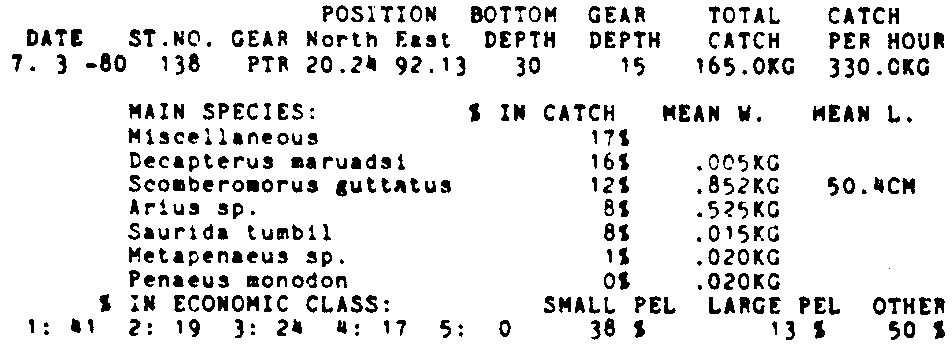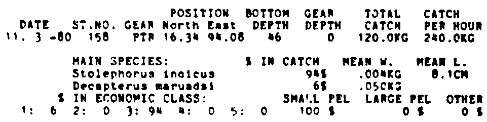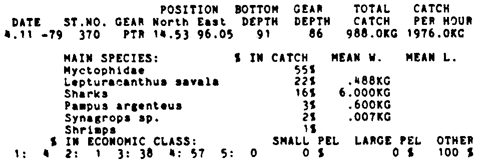 Only the five most important species are listed plus all shrimp catches. For some of the species the percentage of total catch is given as 0%. This means that the species in question is present at the station, but is less than 1% of the total catch.