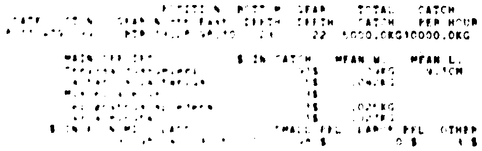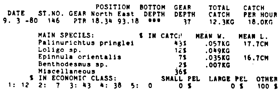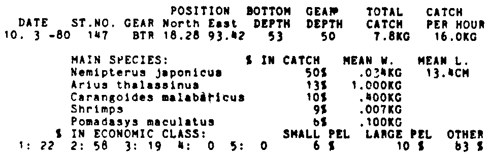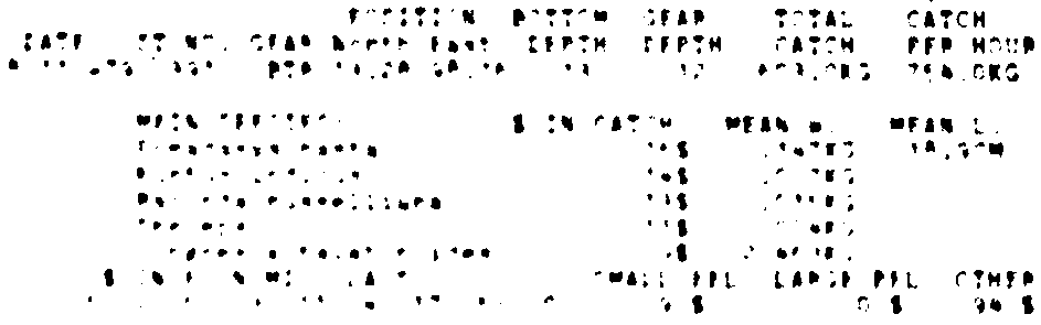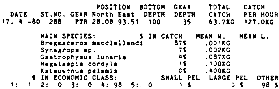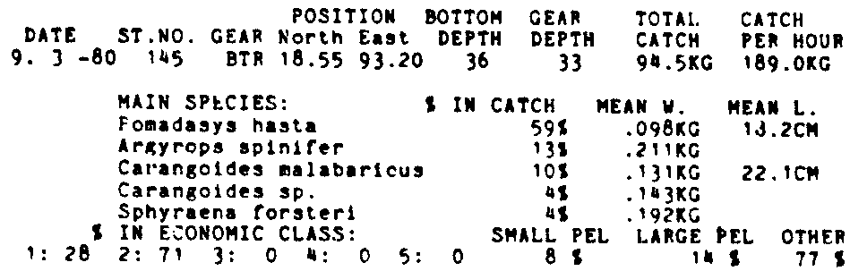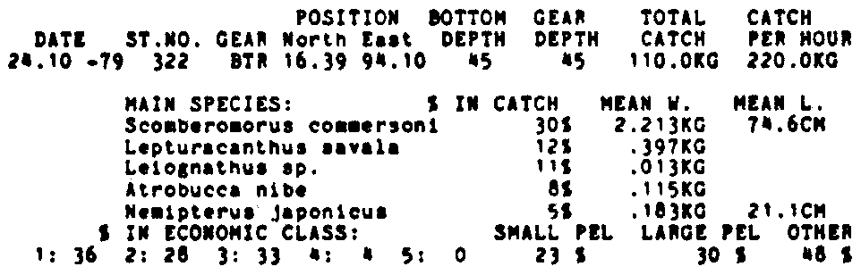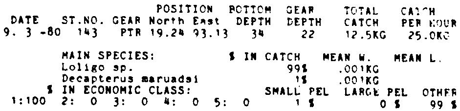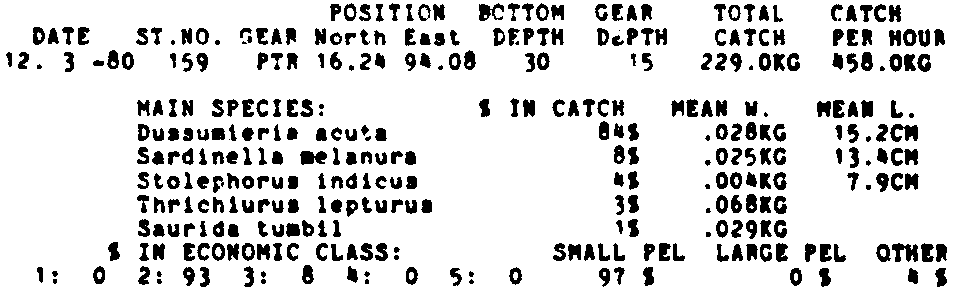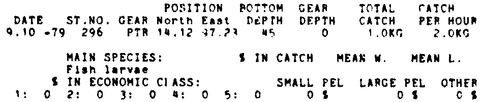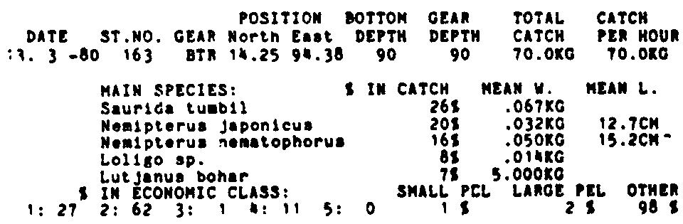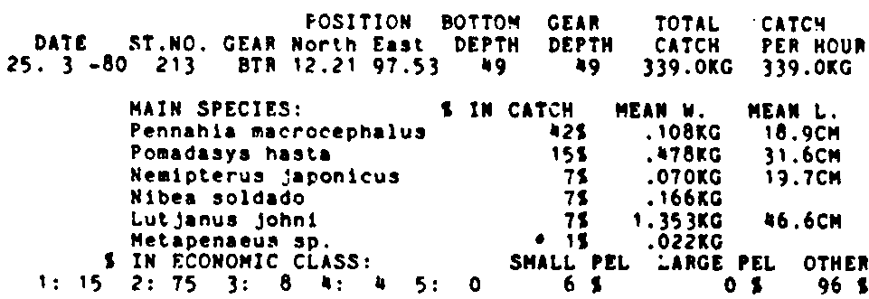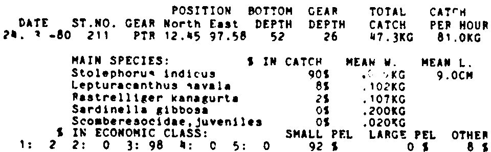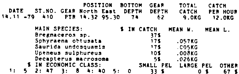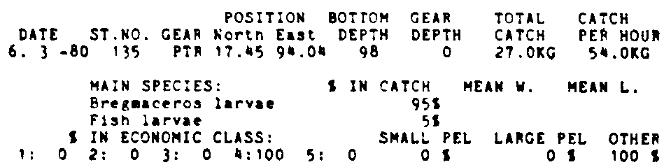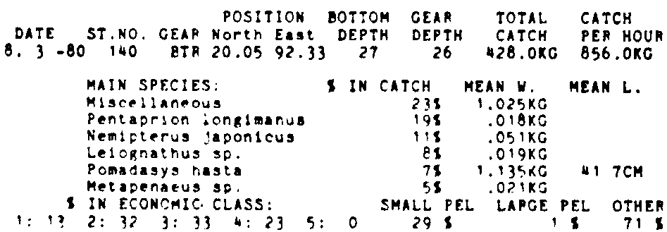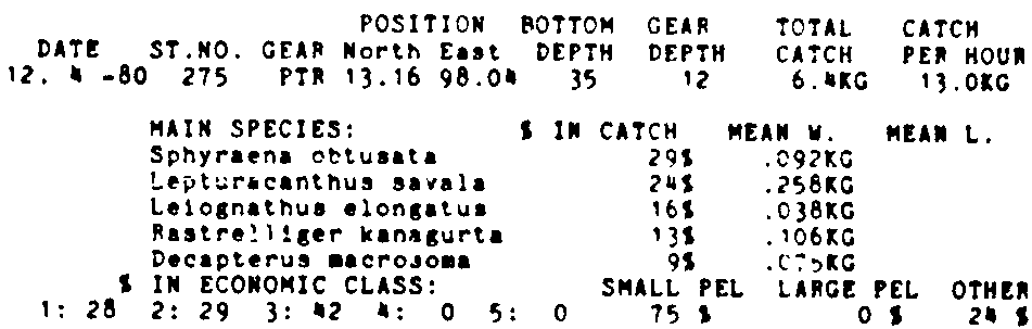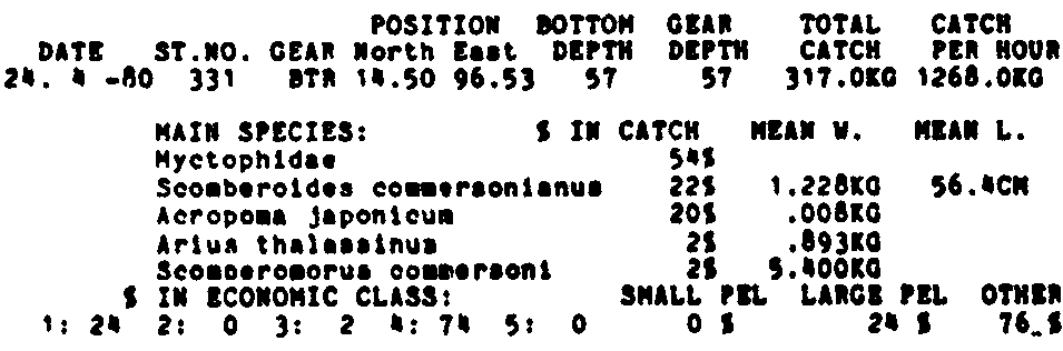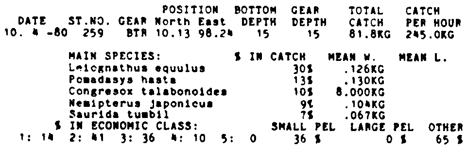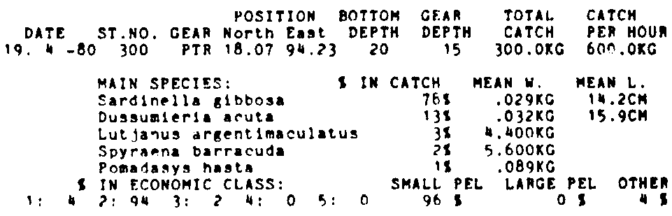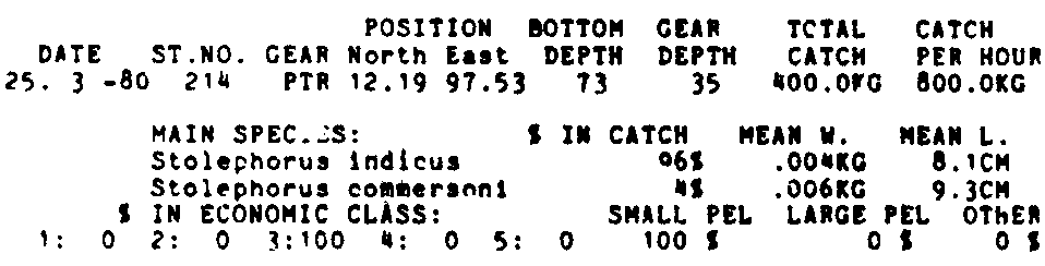 Only the five most important species are listed plus all shrimp catches. For some of the species the percentage of total catch is given as 0%. This means that the species in question is present at the station, but is less than 1% of the total catch.