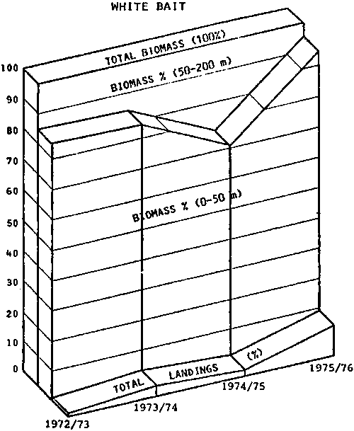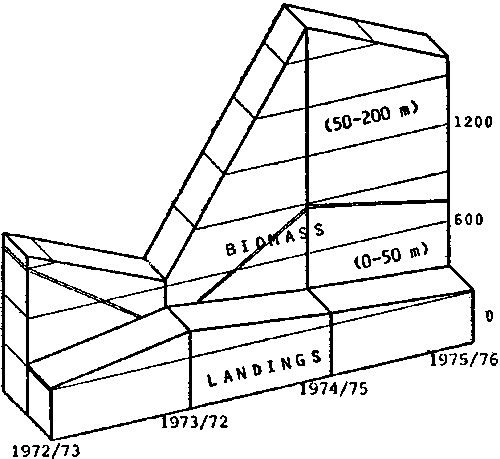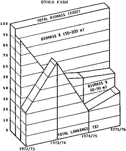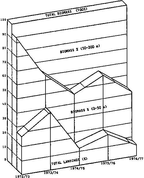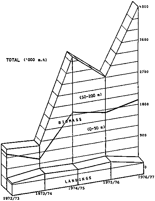 1. There was an obvious lack of relationship between total landings and estimated biomass of target species (this is also confirmed by the low values of the estimated linear correlation coefficients), and2. As the estimated biomass increases the shift in biomass occurs offshore, away from existing fishing effort (0-50 m), therefore fishing effort does not reflect these changes, or benefit from them directly.