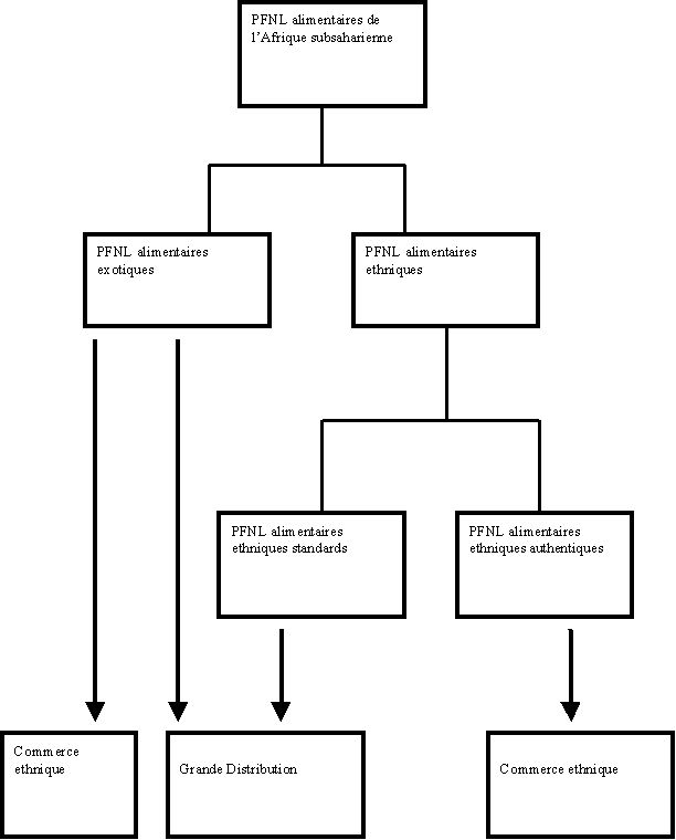 Au vu de cette organisation de la vente des produits agro-alimentaires dans la Grande Distribution, seuls PFNL alimentaires exotiques et les PFNL alimentaires ethniques standards peuvent intégrer la Grande Distribution (cf. Fig. 1). Cependant cette intégration ne peut se faire sans contraintes. L'une d'elles consiste à mettre en place, notamment dans le cadre des PFNL alimentaires ethniques standards, une politique de marketing efficace. En effet, la dynamique du marché des aliments ethniques se heurte à trois obstacles principaux : l'insuffisance de l'offre, la méconnaissance des utilisations des produits par les européens et le déficit d'information sur les valeurs autres que nutritionnelles des produits. Les consommateurs européens des aliments ethniques veulent découvrir, en consommant ce type d'aliments, les valeurs culturelles dont ils sont le support. Aussi exigent-ils de plus en plus d'informations, non seulement sur la façon d'utiliser le produit, mais également sur ses valeurs symboliques. En plus, une politique visant à faire connaître les produits est indispensable. Plusieurs stratégies peuvent être envisagée, mais selon les professionnels le développement des restaurants africains est un passage obligatoire. C'est ainsi que les aliments asiatiques se sont révélés aux Français et aux Belges (Daineffe, 1994 ; Askenazi, 1997 ; Van Der Linden, 1997). Ils ont constitué la deuxième étape lors du passage des aliments asiatiques des pays exportateurs au consommateur européen. Aussi, les commerçants asiatiques ont développé les restaurants dans toute l'Europe. En France leur nombre est estimé à 20 000 (Le Huu Khoa, 1996) dont 7 000 à 10 000 dans l'agglomération parisienne. Quant aux restaurants africains, leur présence reste discrète. Des parts de marché importantes restent à conquérir par la cuisine africaine en France, qui est riche et diversifiée tant en Afrique sahélienne qu'en Afrique forestière (Grimaldi et Biyoki, 1982 ; Andriamirado, 1997 ; Bakayoko et al., 1998).