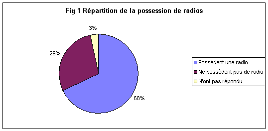 Il a été établi que 67,8% des femmes possèdent un récepteur radio alors que 28,9% n'en ont pas. Le graphique ci-après montre la répartition des possesseurs de radios.