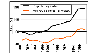 COMMERCE ET SÉCURITÉ ALIMENTAIRE![]() Figure 1 : Commerce des produits alimentaires et agricoles dans le monde en développement Le commerce mondial des produits alimentaires et agricoles est toujours aussi dynamiqueLa valeur du commerce mondial des produits agricoles, y compris les produits de la pêche et de la forêt, a plus que doublé depuis 1980, atteignant près de 650 milliards de dollars des États-Unis en 1995-97. La part des produits agricoles dans le commerce des marchandises a progressivement diminué, pour s'établir actuellement à 12 % environ du niveau mondial. Cette moyenne masque toutefois la dépendance bien plus forte vis-à-vis du commerce agricole d'un grand nombre de pays en développement, qu'ils soient exportateurs ou importateurs. Dans 25 % environ des pays, les exportations agricoles représentent plus des deux tiers des exportations totales, tandis que, dans une autre tranche de 20 % des pays, leur part est supérieure à un tiers. Les pays à faible revenu restent les plus fortement tributaires du commerce agricole, car souvent encore ils tirent la plus grande partie de leurs recettes en devises des exportations d'un seul ou d'un petit nombre de produits agricoles.Le commerce des produits alimentaires a aussi affiché des tendances analogues depuis le début des années 70. La valeur du commerce alimentaire mondial en 1995-97, soit environ 315 milliards de dollars, était deux fois plus élevée qu'en 1980-82. Les pays en développement ont contribué pour environ 26 % du commerce alimentaire mondial en 1995-97, mais cette part est à peu près la même qu'en 1980. Au cours de cette période, la facture totale des importations alimentaires des pays en développement a augmenté de 70 %, pour atteindre 100 milliards de dollars à l'heure actuelle (fig. 1). Ces tendances font ressortir non seulement l'importance croissante du commerce dans la satisfaction des besoins de la consommation alimentaire, notamment pour les pays en développement, mais aussi la progression de leurs importations alimentaires. LA SITUATION DE LA SECURITE ALIMENTAIRE DANS LES PAYS EN DEVELOPPEMENT RESTE INACCEPTABLELe nombre de personnes sous-alimentées dans le monde atteint toujours des proportions inacceptables. En 1995/97, on a estimé ce nombre à 820 millions environ, dont la plus grande partie - 790 millions - dans les pays en développement. Quelques progrès ont été observés au cours des dernières années, le total dans le monde en développement ayant diminué de 40 millions entre 1990/1992 et 1995/1997. Cette baisse s'explique toutefois par les résultats extraordinaires obtenus par 37 pays seulement, qui sont arrivés à opérer une réduction totale de 100 millions. Dans le reste du monde en développement, le nombre de personnes souffrant de sous-alimentation chronique a en fait augmenté de près de 60 millions. Pour le groupe des pays les moins avancés, le pourcentage des personnes mal nourries s'établit à 38 % et n'a pas changé depuis seize ans (fig. 2).