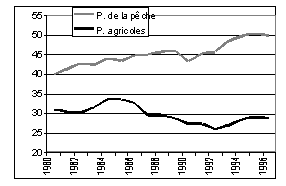 COMMERCE MONDIAL DES PRODUITS DE LA PECHE ET QUESTIONS NOUVELLES S'Y RAPPORTANTLE COMMERCE MONDIAL DES PRODUITS DE LA PECHE ET LES PAYS EN DEVELOPPEMENTLa production mondiale de poisson s'établit actuellement à quelque 122 millions de tonnes. Avec 15,9 kg par habitant en 1997, l'offre mondiale moyenne de poisson en tant qu'aliment n'a jamais été aussi forte. Le commerce international de poisson et des produits de la pêche a atteint 52 milliards de dollars en 1994-96, soit plus du triple du chiffre enregistré pour la période 1990-92 (figure 1). En comparaison, la valeur du commerce agricole (sans la pêche) n'a que doublé au cours de la même période.Le commerce de produits de la pêche revêt une importance particulière pour les pays en développement. Leurs exportations de poisson et de produits de la pêche ont crû de manière impressionnante, ayant quadruplé par rapport à 1980-82 pour atteindre 25 milliards de dollars en 1994-96. En conséquence, leur part dans le commerce de ces produits est passée de 40 % en 1980-82 à 50 % en 1994-96. Par contre, la part qui leur revient dans la valeur totale du commerce agricole mondial, non compris les produits de la pêche, a en fait diminué au cours de cette période (figure 2). Plusieurs questions nouvelles d'importance internationale se posent dans le domaine du commerce mondial des produits de la pêche et de l'aquaculture. Ces questions sont plus ou moins liées les unes aux autres. Ainsi par exemple, l'existence d'une surcapacité de pêche résultant de la tendance généralisée au surinvestissement et d'une surexploitation par suite de la non-réglementation de la pêche a été nuisible à l'utilisation durable des ressources mondiales de la pêche et à la préservation des colonies de poissons et de leur biodiversité. L'on trouvera ci-après un bref compte rendu sur ces questions d'acuité croissante et sur le rôle joué par la FAO pour y trouver des solutions.