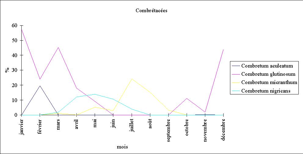 - Certaines espèces ne sont prélevées qu'à des stades bien précis : Combretum aculeatum pendant sa floraison. D'autres sont consommées durant toute la saison sèche, d'octobre à mai, à tous les stades de leur cycle végétatif (Combretum glutinosum).