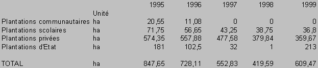 Plantations < 25 ans (15 449 400 ha) : elles donnent essentiellement le bois d'énergie et de service à raison de 33 m3/ha en raison de la faible productivité des plantations collectives mal entretenues ;