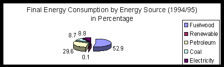 Energy in Botswana is characterized by both traditional and commercial energy. Fuelwood is the dominant and most accessible energy source in Botswana. During the period between 1981-1994, the share of fuelwood in annual total of energy supply and demand has been estimated at over 40%. The share ranged from 48% to 63% for Primary Energy Supply (PES), 55% to 77% for Net Energy Supply (NES), and 44% to 58% for Final Energy Consumption (FEC). Throughout the early 1990s fuelwood has accounted for more than 90% of the total annual energy consumption in the household sector, particularly in the rural sub-sector. Studies have shown that other conventional energy source like electricity, petroleum products and coal are not widely used of because they are not affordable and/or accessible. (Environ. Statistics, 2000).