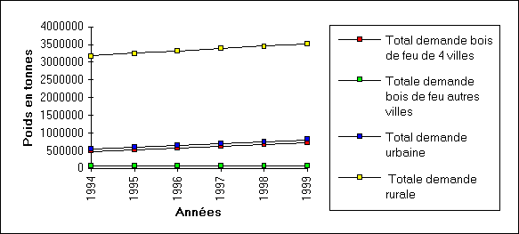 Les données sont disponibles pour une période allant de 1987 à l'an 2010. La demande industrielle et commerciale n'est pas spécifiquement ressortie. La demande commerciale qui concerne l'activité des restaurateurs et autres brasseurs traditionnels a été combinée à l'ensemble de la demande domestique des ménages. La demande industrielle n'a aucune donnée chiffrée parce que tout simplement inexistante. Le tableau 1 présente la situation de la demande pour 4 villes (Ouagadougou, Bobo-Dioulasso, Koudougou et Ouahigouya), pour les autres villes, pour l'ensemble de la demande urbaine et enfin pour l'ensemble de la demande rurale. Le niveau local est limité aux quatre villes ci-dessus mentionnées. La fragilité de ces données repose essentiellement sur la longue période de projection (1987 à 2010) en se basant sur des données calculées pour l'année 1987. L'ensemble du calcul se base sur une certaine hypothèse du taux d'accroissement annuel de la population qui est le suivant: