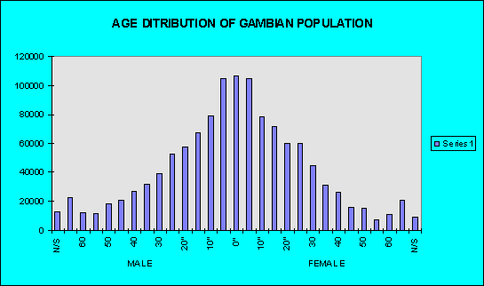 Table: 1 and Figure 1 illustrate the population of The Gambia by age and sex distribution based on the 1993 population census. The Gambia has a very high population growth rate of about 4.1% per annum. The majority of the population is within the ages ‘0–19’, forming over 50% of all the populace. The high rate of population growth has serious socio-economic implications, including forest depletion both from establishment of settlements and other economic activities.