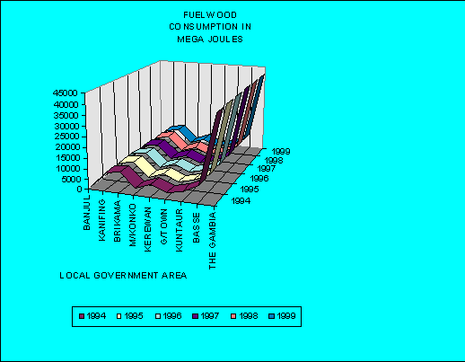 Tables 5 through 11 give the trend of fuel usage for cooking by Local Government Area (LGA). These tables support the dominance of firewood as the Gambian source of fuel for domestic use. The individual fuel-usage trend, except firewood, has not been as steady. Five years ago however, relatively more households used firewood than today. In addition, the proportion of households using Butane-gas (LPG) has increased.