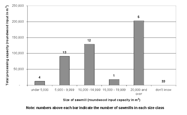 Figure 2 Capacity of sawmills in different size classes in Suriname (1990, partially updated to 1998)