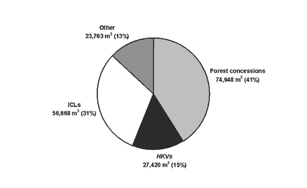 Precise information about the location of production will only become available when the database of forest concessions is completed and fully operational. However, as a working assumption, it would seem reasonable to assume that 60% of production comes from the forest belt, 20% comes from further into the interior of the country and 20% comes from forests closer to the coast.