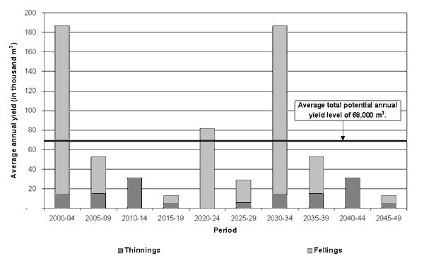 As the figure shows, with a rotation of 30 years and assuming a maximum mean annual increment of 15 m3/ha/year, a considerable amount of pine roundwood will shortly be available for processing. The near-term peak in potential production is due to the escalation of pine planting which took place in the early 1970's (see Figure 4). However, even if production was to be smoothed-out in the future, potential yield could be as high as 68,000 m3/year. If yields are only 10 m3/ha/year, then production might only be two-thirds of this, or 46,000 m3/year, but this still a significant amount of roundwood that could be processed.