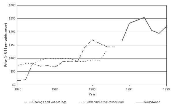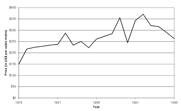 The statistics on timber trade are presented by the FAO in their Yearbook of Forest Products (FAO, 1998 - also available on CD-ROM and at the FAO Website). These show trade by volume and by value and, by dividing one by the other, it is possible to calculate average trade prices for broad product aggregates (e.g. sawnwood or plywood). Figure 6 to Figure 8 show export prices derived from the FAO trade data in this way, for the years 1976 to 1996.