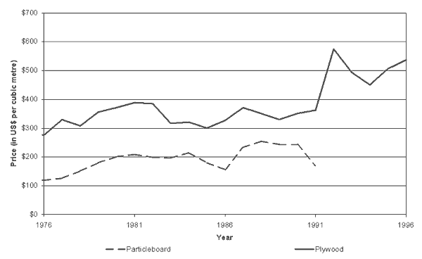 Figure 8 The price of wood based panels exported from Suriname 1976 - 96