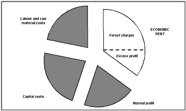 There is a further complication in the case of forests (and some other types of natural resources), in that these resources are essentially produced for free (i.e. the resources occur naturally, although the production of outputs from these resources involves a production cost). Therefore, it is not possible to look at the cost of creating the resource as a guide to what the charge for using it might be. Furthermore, unless there is a private forest owning sector, it is not even possible to get a reference price for the value of these outputs from the private sector. Therefore, in the case of forests and other natural resources, the amount that the government charges for the use of the resource has to be calculated from a theory and economic rent is often chosen as an appropriate measure on which to base forest charges.