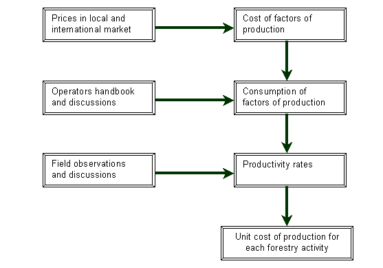 This information was used, with the raw data about the costs of individual items, to produce unit production costs for each forestry activity, using a simple spreadsheet model constructed for this purpose (see Whiteman, 1999a for further details of the roundwood production cost model used in this analysis). A simplified picture of the process used to estimate unit costs of production is given in Figure 2.