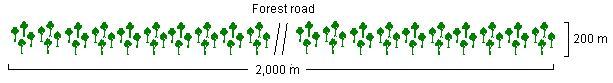 average skid trail construction, with planned skid trails, is much higher (+300% to +400%) with skid trails 200 m apart than with skid trails 100 m apart, due to the high number and length of side trails that would be required (it should be noted however, that this is largely a result of the simplicity of the model – in reality, it would be expected that a wider distance between skid trails would result in more skid trail construction overall, but not by as much as the model suggests);