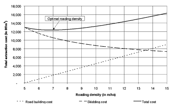 The total roundwood production cost figures presented in the previous sections of this report assumed a road density of 5 m/ha, with skid trails 200 m apart. According to the simulation model, this would result in a skid-trail indirectness factor of 82% and an average skidding distance of 910 m. This is a very long skidding distance compared with current forestry practice in many other tropical countries. However, it was confirmed, during several field trips and interviews with forest concessionaires, that average skidding distances of around 1 km are typical of current forestry practices in Suriname.
