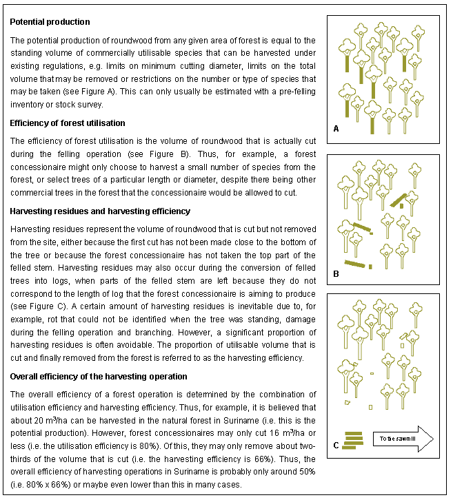 improvements in the efficiency of forest utilisation - i.e. encouraging forest concessionaires to take all commercial standing timber available during each harvesting operation and improve the harvesting efficiency (i.e. reduce harvesting waste during operations); and