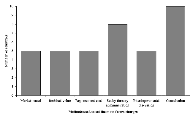 The number of countries using each of the six different methods to determine forest charges is shown in Figure 10. Many countries use (or have used in the past) more than one method and, in these cases, all of the methods used in a country have been included in this figure. In addition, two countries (Burkina Faso and Lesotho) have not revised their forest charges for a very long time, so it was not possible to describe the processes used to set their forest charges.