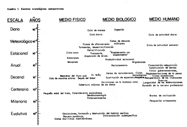 Los recursos pesqueros experimentan variaciones en casi todas las escalas cronológicas. Además, en la variabilidad biológica influyen notablemente la variabilidad física o ambiental por un lado, y la variabilidad del sector humano por otro (Cuadro 1). Buena parte de la dinámica de las pesquerías y de las dificultades en la historia de su explotación y ordenación (por ejemplo, los auges y colapsos) pueden inferirse de la interacción de fuerzas que actúan en escalas de tiempo diferentes. Como en el caso de la ecología clásica de los ciclos predador/presa, los retrasos en la respuesta de la explotación pesquera a la abundancia de un recurso determinan un sistema inherentemente cíclico o inestable. Reconociendo el carácter de esas interacciones y adoptando normas apropiadas y eficaces, los responsables de la ordenación pueden controlar y reducir al mínimo esos ciclos de la tecnología pesquera dentro de los límites de la variabilidad natural del ambiente.