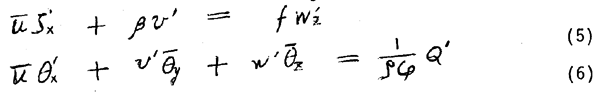 Eq. (5) is the linearized form of quasi-geostrophic vorticity equation, which is a good aproximation of the vorticity equation for the slowly varying large-scale motions except in the vicinity of the equator. Eq. (6) is the linearized form of the thermodynamic equation. Elements with the bar and the superscript indicate basic and forced parts respectively. u,v and w are velocities in the eastward (x), northward (y) and vertical (z) directions respectively; 5, the vertical component of vorticity (=vx -uy); f, the Coiolis facto;β=df/dy; θ, potential temperature; Q, diabatic heating rate; ρ, density of the air; cp, the specific heat of the air. The subscripts x, y, and z, indicate derivatives with respect to the subscripted variables.