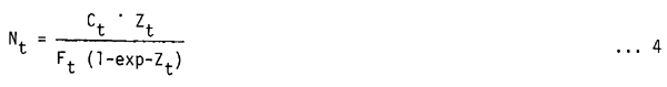 A terminal fishing mortality Ft=1.2, corresponding with M=1.2 to an exploitation rate (E=F/(F+M) of 0.5 was used to estimate terminal populations for both VPA II (using Equation 6) and VPA III (using Equation 4). Since E=0.5, as will be shown below, was reached in the mid-60's, the terminal populations have been underestimated in the earlier years, and overestimated in the later years.