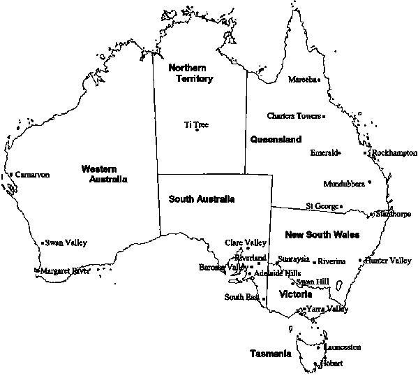 Grapes are grown in all States of Australia but most of the production is in the temperate zone. The three largest States by production are South Australia (Riverland), Victoria (Sunraysia) and New South Wales (Riverina) (Table 1). Wine grapes are grown in all States, table grapes in all States except Tasmania and raisins in Victoria, New South Wales, South Australia and Western Australia. Important grape production districts are shown in Figure 1.