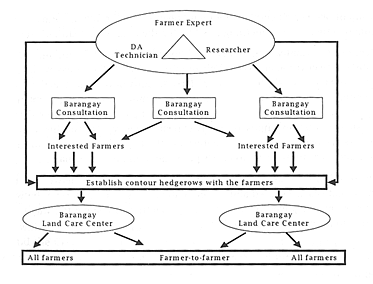 Once it is clear that there is a critical threshold of local interest in adopting the technologies and a spirit of self-help to share the knowledge within and among the villages of a municipality, then the conditions are in place to support the implementation of a municipal conservation team. The team is composed of an extension technician from Department of Agriculture (DA) or DENR, an articulate farmer experienced in the application of the technology, and an outside technical facilitator (Figure 1).