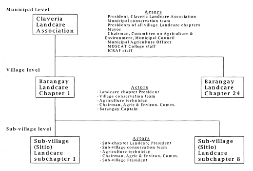 At the municipal level, the Landcare Association is a federation of all of the barangay Landcare chapters. The municipal conservation team is part of the support structure, which also includes other organizations that can assist the chapters (e.g., DA, DENR, NGOs). See Figure 2 for the organizational setup of the Claveria Landcare Association.