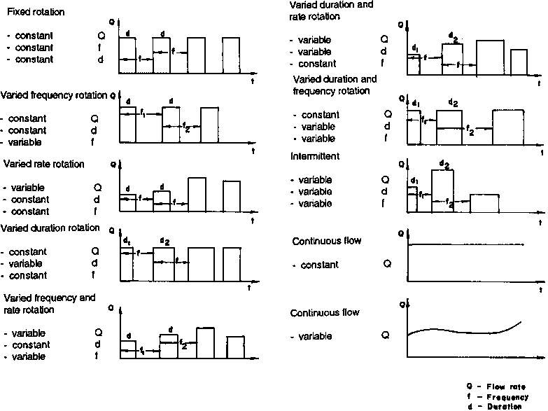 Depending on the topographical situation and the extent of the command area, the canal system has several structures in it. These structures consists of both for conveyance as well as water control structures. The water control in irrigation canals is broadly classified as (i) upstream control, (ii) downstream control and (iii) mixed control. In almost all the irrigation systems in Asia, the upstream control is adopted in the irrigation canals. From the canal system, water is delivered to the tertiary units and the delivery patterns are defined by the frequency, rate and duration. These could be in any one of the forms as shown in Fig. 1. Timeliness is another factor that needs to be taken into consideration. Ankum (1991) outlined the flow control procedures and structures in canal irrigation systems.
