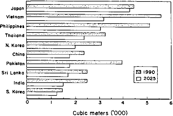Scarcity of water will be another serious issue in future, particularly of clean water. The per caput availability of renewable freshwater (PCA) will decline by 50% in the next 25 years (Shahrizaila bin Abdullah, 1994). About nine Asian countries will have a low PCA. China and India are among the countries with the lowest PCA.