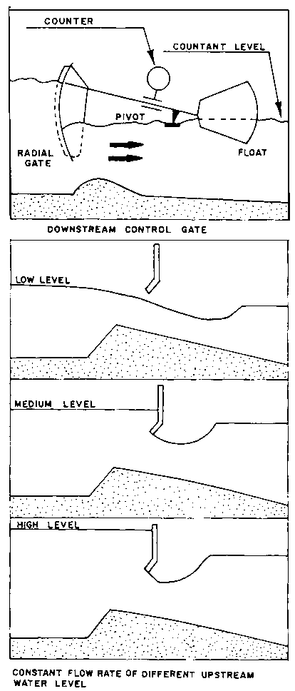 A check gate is constructed for the purpose of keeping the level of water constant in the main canal for ensuring stable diversion in proportion to openings. Check gates are classified into those which keep the level of water constant by means of floats and those which keep the level of water constant by means of the linkage of water level measurement and the control of openings.