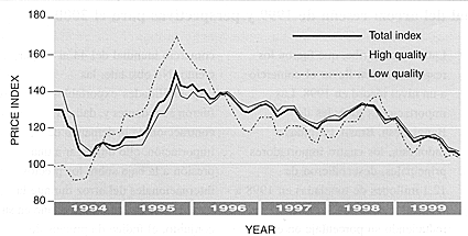 International rice prices from most origins were on a downward trend during most of 1999, as good harvests in a number of the major exporting countries coincided with a production recovery in many of the major importing countries. The FAO Rice Export Price Index (1982-84 = 100) started the year with a monthly average of 125 points in January and ended with an average of 105 points in December. For the year as a whole, the index averaged 114 points during 1999, down from the 1998 average of 127 points and the lowest since 1994. Prices for the lower-quality rice grades declined the most, as import demand for such qualities was particularly weak.
