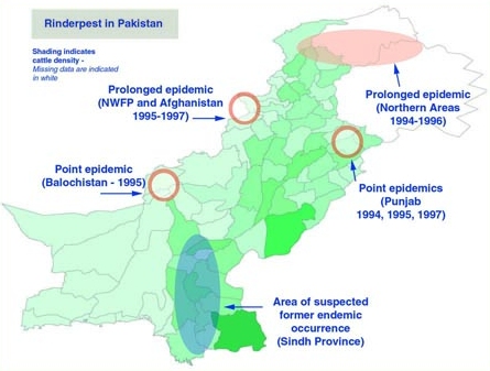 The participants were directors-general and/or directors of livestock/animal husbandry for the provinces of Balochistan, North-West Frontier, Punjab and Sindh, and for the Northern Areas and Azad Kashmir, with the directors and senior veterinary staff of the NARC Animal Sciences Institute (Islamabad) and the Veterinary Research Institutes (Lahore, Quetta). The workshop provided an opportunity to access information available on rinderpest occurrence in Pakistan. Reports considered were both laboratory confirmed as well as suspected outbreaks where there was strong clinical, pathological and epidemiological evidence that the disease observed was rinderpest. Subsequently, Dr Taylor visited all of the provinces and areas with national staff. This enabled the understanding of recent rinderpest occurrence to be extended further.
