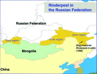 The occurrence of rinderpest in the far eastern part of the Russian Federation, reported in August 1998 by the Veterinary Department of the Russian Federation to the International Office of Epizootics (OIE) was a cause of grave concern for the Global Rinderpest Eradication Programme (GREP). The Russian Federation had hitherto been considered to be free from rinderpest and there was no known connection to the nearest foci of rinderpest persistence thought to be in Pakistan. OIE proposed that FAO should participate in a mission, with an FAO rinderpest expert, to explore with the Russian authorities the circumstances leading to the outbreak.