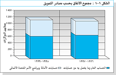 1 - حسبما ذكر المدير العام فى المقدمة، فان المنظمة سعت الى تسليم برنامج عملها المعتمد فى ظل تقشف مستمر. وبقيت اعتمادات البرنامج العادى بدون تغيير بمبلغ 650 مليون دولار، مما انطوى على انخفاض بالأرقام الحقيقية. وكما يتضح من الشكل 1-1، فلقد زادت المصروفات الكلية بزهاء 3 فى المائة، من 162 1 مليون دولار فى الفترة 1996-1997 الى 200 1 مليون دولار فى الفترة 1998-1999. ويعزى ذلك، الى حد كبير، الى زيادة قدرها 125 مليون دولار فى مساعدات الطوارئ المرتبطة ببرنامج النفط مقابل الغذاء فى العراق، الذى أسهم فى الزيادة البالغة 16 فى المائة فى المصروفات فى اطار حسابات الأمانة وبرنامج الأمم المتحدة الانمائى. أما المصروفات فى اطار الحساب العام والحسابات ذات الصلة، والتى تشمل اعتمادات البرنامج العادى وتسديد الأموال من أنشطة الاستثمار بالتمويل المشترك وتكاليف الدعم، فقد انخفضت بنحو 5 فى المائة.