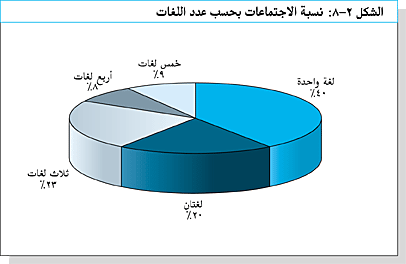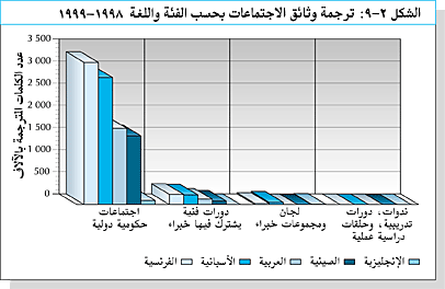 54 - ويبين الشكل 2-7 نمط اللغات المستخدمة فى الاجتماعات فى المقر الرئيسى بحسب الاقليم. ومن الواضح أن اللغة الانجليزية هى اللغة الغالبة فى الاجتماعات التى تعقد فى المقر الرئيسى فضلا عن آسيا والمحيط الهادى وأوروبا. وفى أفريقيا تستخدم اللغتان الانجليزية والفرنسية بصورة متساوية تقريبا. وفى أمريكا اللاتينية والبحر الكاريبى فان اللغتين الأساسيتين هما الاسبانية والانجليزية. وفى الشرق الأدنى وشمال أفريقيا تستخدم العربية والانجليزية. وعندما تعقد الاجتماعات بلغة واحدة، فانها تنحو الى أن تكون الانجليزية حيث أن ذلك كان هو الحال فى 94 اجتماعا من بين 100 اجتماع عقدت بلغة واحدة فى 1998-1999. وتدرج اللغة الانجليزية عادة عندما تستخدم لغات أخرى. وقد عقد اجتماع واحد فقط بعدة لغات فى 1998-1999 لم تكن الانجليزية من ضمنها.