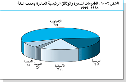 60 - وكما يتبين من الشكل 2-10 كانت اللغة الانجليزية تشكل أكثر من نصف مجموع المطبوعات المسعرة والوثائق الرئيسية فى 1998-1999. وتمثل اللغة الفرنسية 17 فى المائة والاسبانية 15 فى المائة والعربية 5 فى المائة. وتمثل الوثائق الصادرة باللغة الصينية 9 فى المائة ن المجموع وهى تصدر فى كل من المقر الرئيسى وفى الصين من خلال برنامج النشر الصينى. وينفذ هذا البرنامج بالتعاون مع الأكاديمية الصينية للعلوم الزراعية ويتميز باشراك هذا البلد بصورة مباشرة فى اختيار الوثائق التى يجرى ترجمتها ونشرها وتوزيعها.