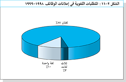 64 - ترتبط اللغة بالمتطلبات العامة للوظيفة. فبالنسبة لكثير من الوظائف التى تزيد عن ف 2، يتطلب الالمام بلغتين على الأقل. ويبين الشكل 2-11 أن أكثر من 85 فى المائة من الوظائف الشاغرة المعلن عنها فى 1998-1999 كانت تتطلب لغتين، و3 فى المائة تتطلب ثلاث لغات. وعلاوة على ذلك، فان 80 فى المائة من الوظائف التى كانت تتطلب لغة واحدة، كانت فيها لغة ثانية من المؤهلات المستحسنة. ويجرى تأكيد الكفاءة اللغوية عند التعيين وعند تأكيد التعيين، وقد يطلب من الموظفين المعينين حديثا اجتياز اختبار كفاءة فى اللغة أو اللغات الرسمية ذات الصلة -الانجليزية والفرنسية والاسبانية والعربية أو الصينية. وقد أصبحت الكفاءة اللغوية، بالنسبة لكثير من الموظفين الحاليين معيارا هاما للترقى.