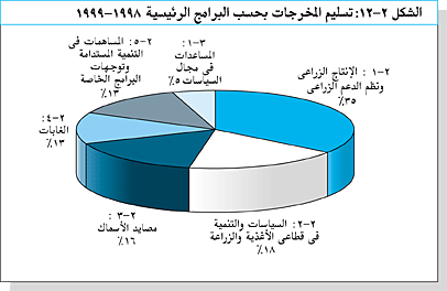 69 - وكان أكبر تسليم للمخرجات من البرنامج الرئيسى 2-1: الانتاج الزراعى ونظم الدعم، حيث بلغت نسبته 35 فى المائة من المجموع، النحو الوارد فى الشكل 2-12. وقدم البرنامج 86 فى المائة من المخرجات ذات الصلة بالتعهدات والاتفاقات الدولية و54 فى المائة من المنهجيات والخطوط التوجيهية و47 فى المائة من التدريب و42 فى المائة من التنسيق وتبادل المعلومات. وقدم البرنامج الرئيسى 2-2: السياسة والتنمية فى قطاع الأغذية والزراعة 18 فى المائـة مـن جميـع المخرجات يليـه البرنامج الرئيسى 2-3: مصايد الأسماك حيث قدم 16 فى المائة، والبرنامج الرئيسى 2-4: الغابات والبرنامج الرئيسى 2-5 المساهمة فى التنمية المستدامة واتجاهات البرامج الخاصة حيث قدم كل منهما 13 فى المائة من المخرجات.