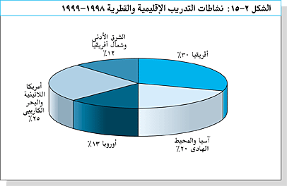 79 - وكما يظهر من الشكل 2-15، فان أفريقيا هى أكبر المستفيدين من مساعدات التدريب خلال 1998-1999 حيث بلغت نسبتها 30 فى المائة ثم اقليمى أمريكا اللاتينية والبحر الكاريبى وآسيا والمحيط الهادى اللذين حصلا على 25 فى المائة و20 فى المائة على التوالى من نشاطات التدريب فى حين حصل كل من الشرق الأدنى وشمال أفريقيا وأوروبا على نحو 12 و 13 فى المائة من المجموع.