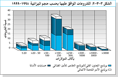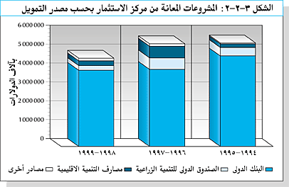 391 - وكان عدد المشروعات التى أعدت بمساعدات كبيرة من مركز الاستثمار وووفق على تمويلها تقل بصورة طفيفة فى 1998-1999 عنها فى 1996-1997 (الجدول 3-2-1)، الاّ أنه مماثل لعددها فى الفترتين الماليتين السابقتين. ففى 1998-1999، ووفق على تمويل 76 مشروعا مقابل 88 مشروعا فى 1996-1997. وبلغ مجموع الاستثمارات 4.7 مليار دولار مقابل 5ر5 مليار دولار فى 1994-1995 و5.4 مليار دولار فى 1996-1997. وبلغت الالتزامات الخارجية بالتمويل 3.2 مليار دولار فى 1998-1999 وهو ما يقل بصورة طفيفة عن 1996-1997 حيث بلغت هذه الالتزامات 3.5 مليار دولار.