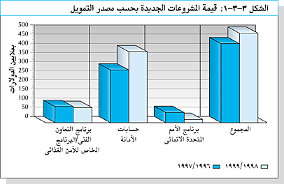 435 - ويتضمن الجدول 4-1-1 عددا من مشروعات برنامج التعاون الفني الجديدة التي ووفق عليها وقيمتها الإجمالية. وخلال كل فترة مالية تتضمن الموارد المتاحة للموافقات على المشروعات الجديدة اعتمادات البرنامج ذات الصلة وأي نقص في التسليم من المشروعات الجارية أو المستكملة، وهو ما يشار إليه بأنه " التدفق العائد". وعلى ذلك، بلغت قيمة الموافقات على مشروعات برنامج التعاون الفني خلال الفترة 1998-1999 ما مجموعه 99.6 مليون دولار، تتكون من اعتمادات البرنامج العادي بقيمة 87.3 مليون دولار، والتدفق العائد بقيمة 10.8 مليون دولار إضافة إلى 1.6 مليون دولار من الرصيد المتبقي لاعتمادات الفترة 1996-1997. وبلغت قيمة مشروعات برنامج التعاون الفني التي تمت الموافقة عليها خلال الفترة 1998-1999 ما مجموعه 92.1 مليون دولار. وستضاف المبالغ المرحلة مؤقتا من الأموال التي لم يتم الالتزام بإنفاقها من اعتمادات الفترة 1998-1999والبالغة 7.5 مليون دولار إلــــى اعتمادات الفترة 2000-2001. وقد أثرت عمليات المواءمة الناجمة عن اللامركزية وتطبيق نظام أوراكل وكذلك الجهود المبذولة لاستخدام ترتيبات التعاون الفني فيما بين البلدان النامية/التعاون الفني فيما بين البلدان التي تمر بمرحلة تحول على نحو مؤقت على عملية إعداد المشروعات والموافقة عليها.