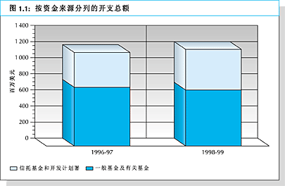 1. 如总干事前言所述,本组织在面临持续紧缩的情况下努力执行批准的工作计划。正常计划拨款未变,仍为6.5亿美元,造成实值减少。如图1.1所示,总开支增加大约3%,从1996-97两年度11.62亿美元增加1998-99两年度的12亿美元。这主要是因为有关伊拉克以油换粮计划的紧急援助量增加1.25亿美元,造成信托基金和开发计划署开支增加16%。一般及有关基金的开支,包括正常计划拨款和共同资助的投资活动及支持费用的偿还额,减少大约5%。