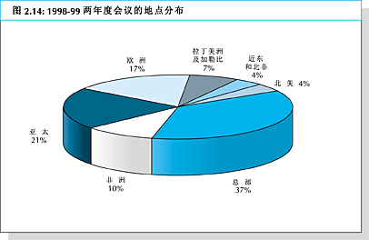 76. 会议地点分布情况见图2.14。粮农组织总部经常是人们喜爱的会议地点,因为它使后勤更为简单,并确保有效的秘书处支持。在1998-99两年度内35%以上的会议在总部召开。亚太是21%的会议的会址,其次是欧洲17%,非洲10%。