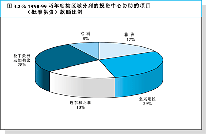391. 1998-99两年度以投资中心大量援助制定并经批准获得供资的项目数字略低于1996-97两年度(表3.2-1),但相当于前两个两年度。1998-99两年度为76个项目获批准供资,而1996-97两年度为88个项目。投资总额为47亿美元,而1994-95两年度为55亿美元,1996-97两年度为54亿美元。1998-99两年度外部供资承诺额为32亿美元,略低于1996-97两年度的35亿美元。