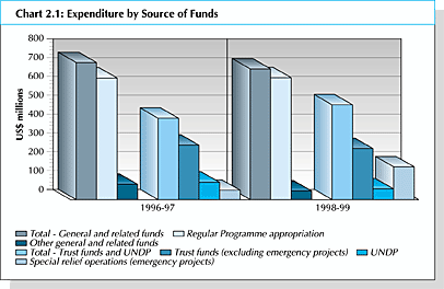 23. Total expenditure in 1998-99 was US$ 1 200 million, US$ 38 million (3.3 percent) higher than 1996-97. Expenditure levels of the past two biennia are illustrated in Chart 2.1. Expenditure under General and Related Funds remained relatively constant; the funding of this expenditure from the Regular Programme appropriation is constant in nominal terms. The remaining sources show a decline of 4 percent for jointly-funded investment activities, 13 percent for trust funds support cost reimbursements and 45 percent for UNDP support cost reimbursements. Under Trust Funds and UNDP, the area of increased expenditure was special relief operations, which increased more than threefold from US$ 51 million in 1996-97 to US$ 175 million in 1998-99, largely as the result of a US$ 120 million increase in the Iraq Oil for Food programme. By contrast, trust funds expenditure (excluding emergency projects) declined by 6 percent and UNDP project expenditure declined by 38 percent in 1998-99 relative to the previous biennium.