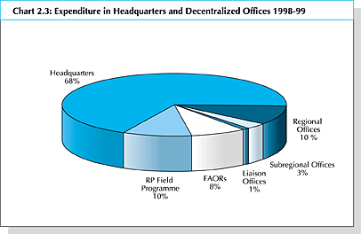 * To avoid distorting the ratio, the Regular Programme-funded programme of work for Chapter 2 comprises all Regular Programme expenditure excluding SPFS project delivery, which amounted to US$ 7 million in 1998-99. This delivery is included under the column headed Field Programme.